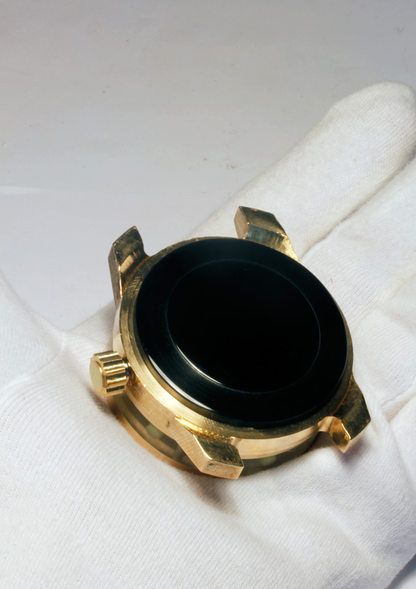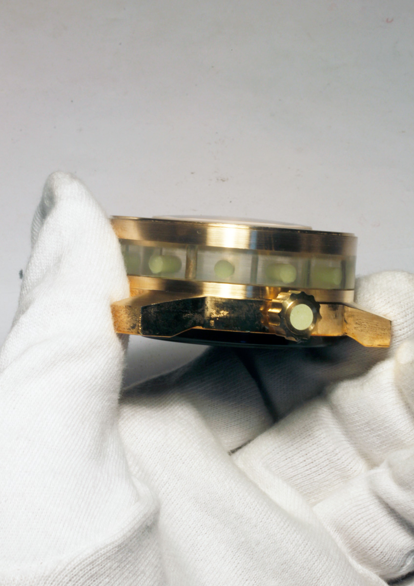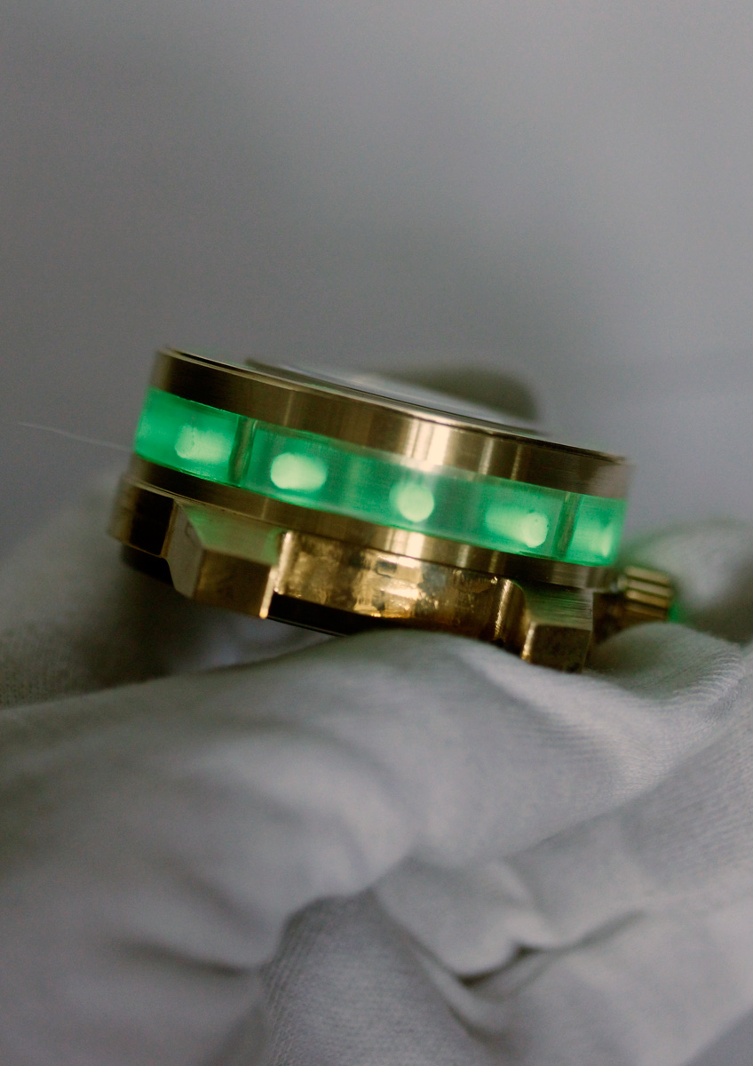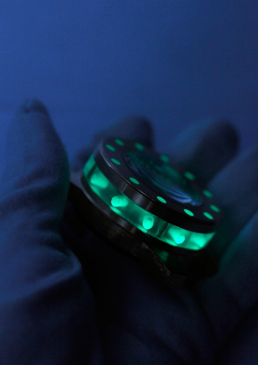 A watch concept that combines different layers of materials such as steel, iron, acrylic glass, sapphire, precious woods, and the extraordinary bioluminescent Émail Lumineuse. The base is always a 55 mm platform for a 26 mm bronze watch strap. The outer side of the base still shows the pattern and structure of the milling.
