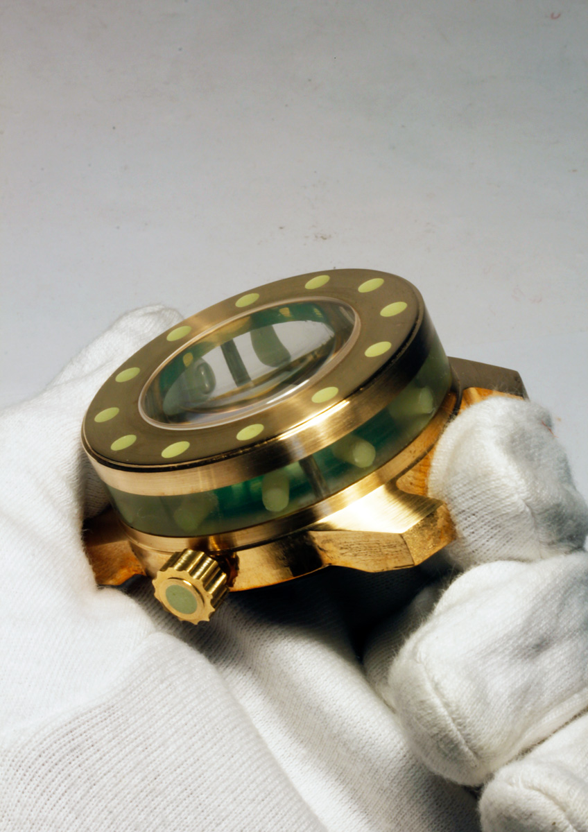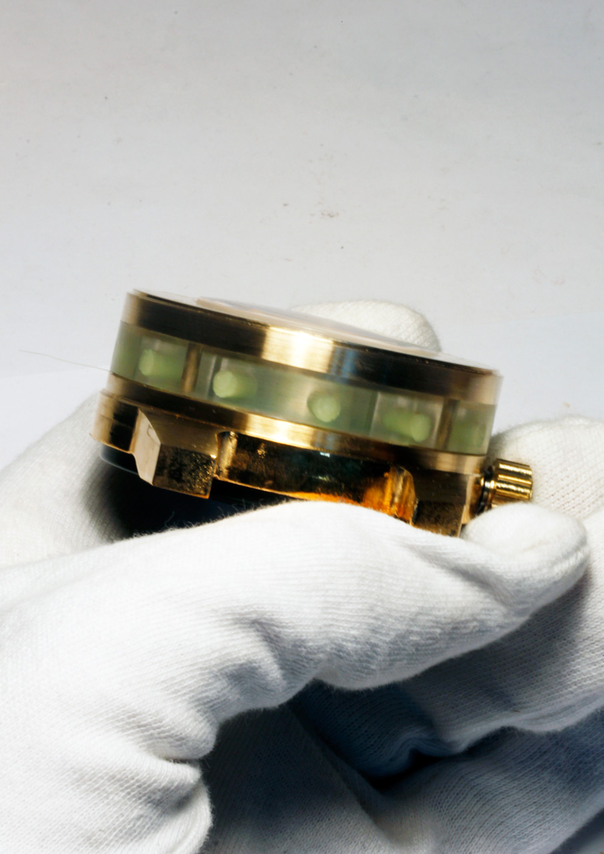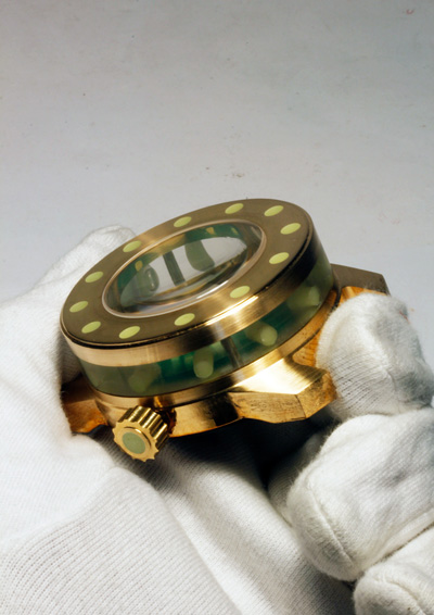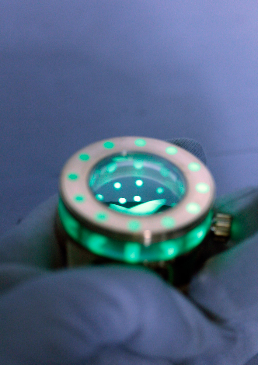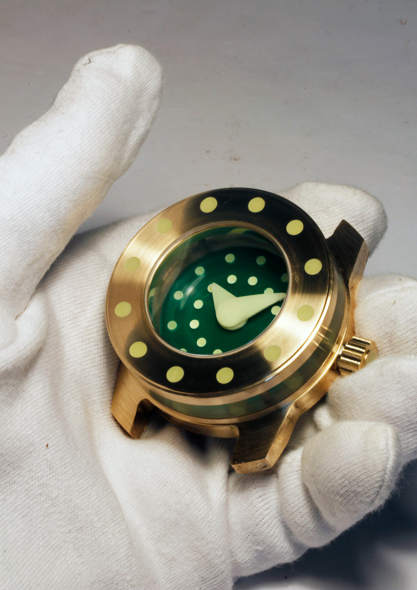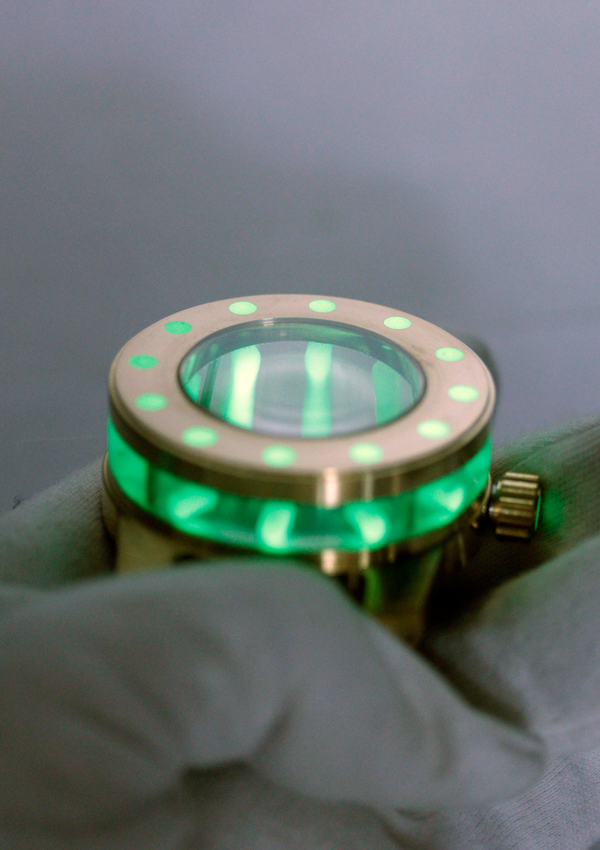 The following materials were combined in this model: Acrylic middle layer with Émail Lumineuse wormholes, a bronze bezel with Émail Lumineuse Hour dots. The dial green acrylic with Émail Lumineuse dots. The pear shape hour and minute Hands solid Émil Lumineuse. Bronze crown with Émail Lumineuse inlay. Movement Automatic caliber ETA 2824