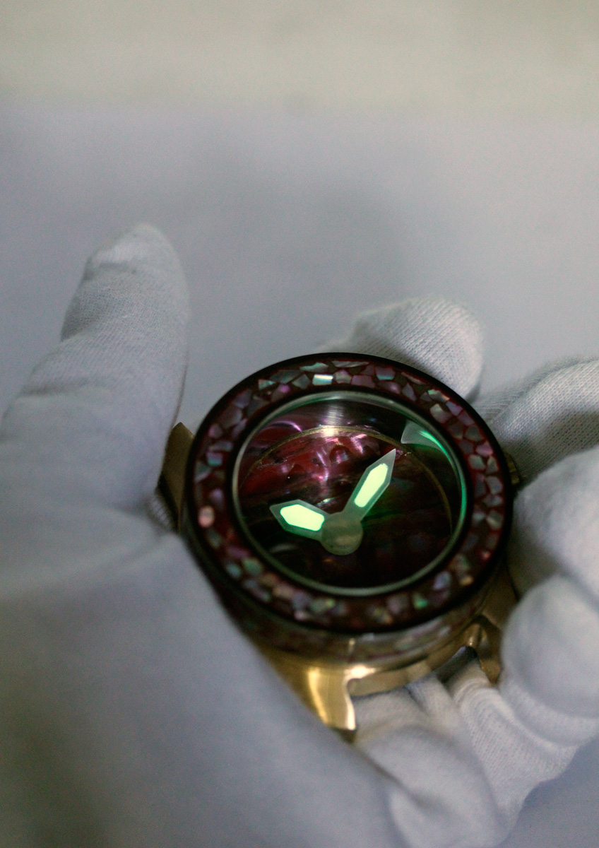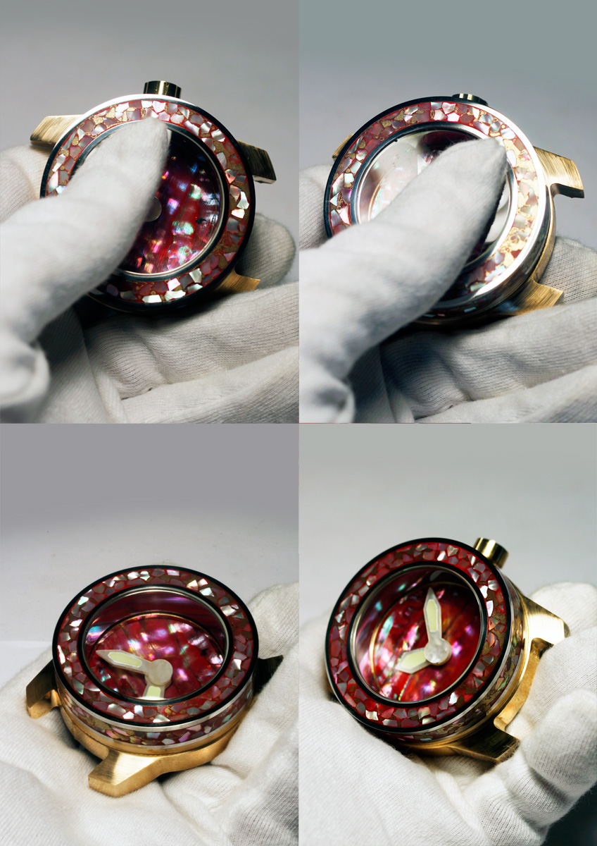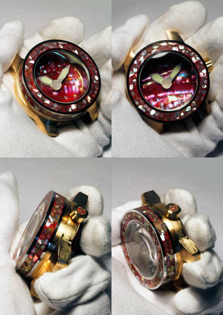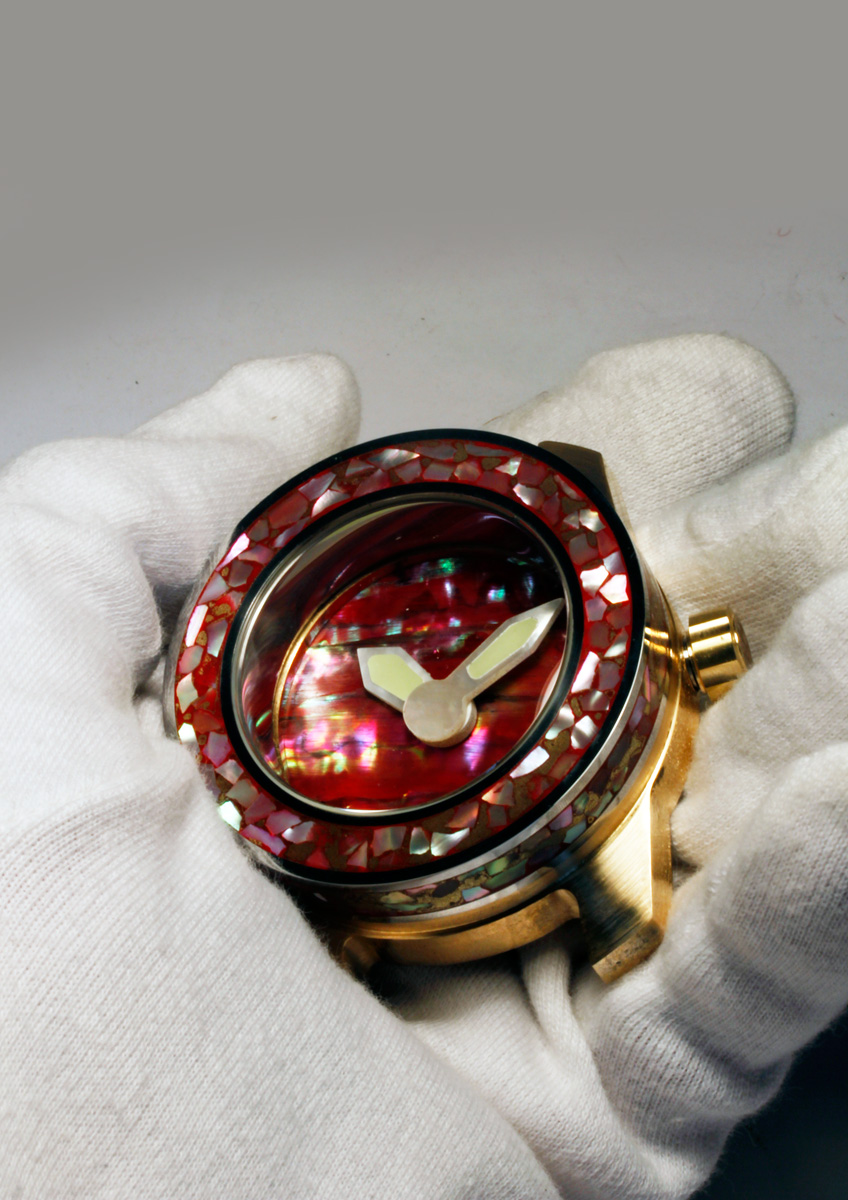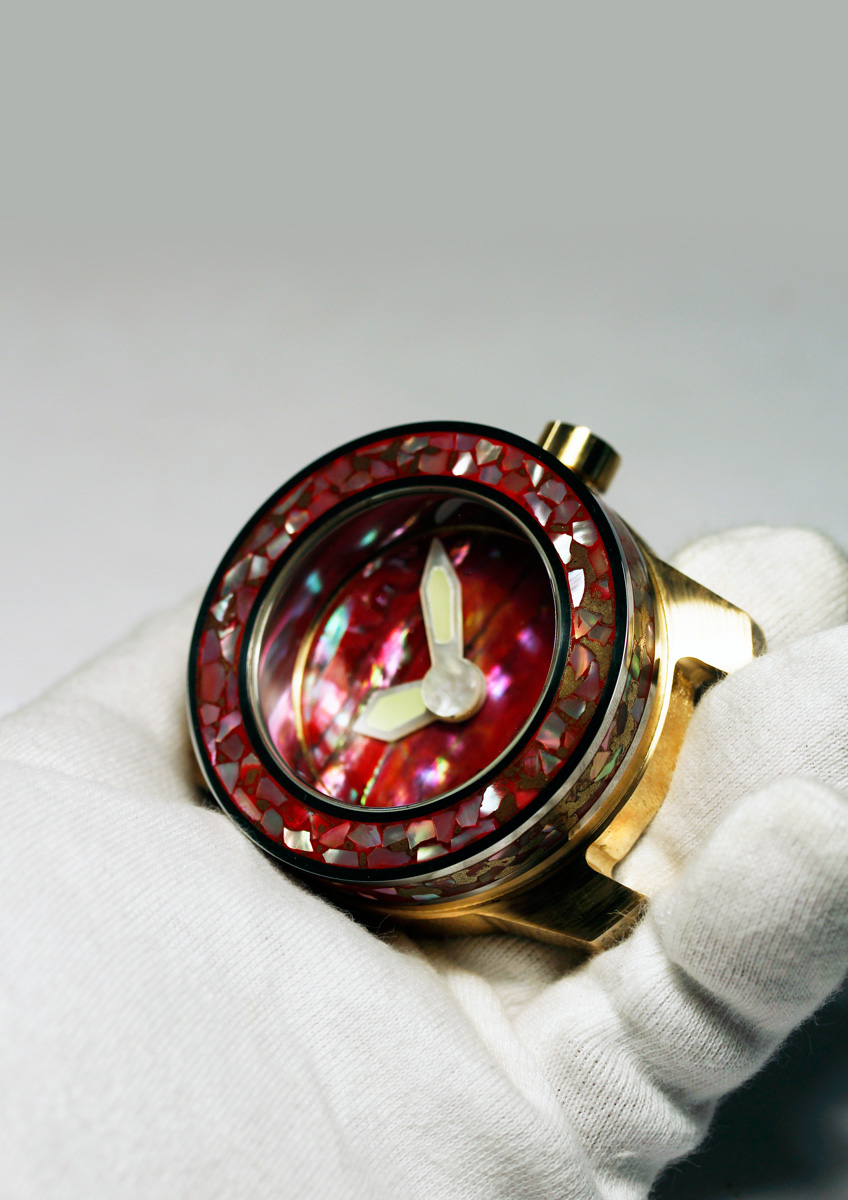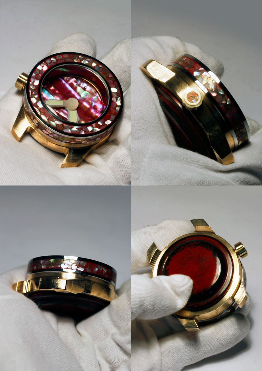 The following materials were combined in this model: Polished iron upper case with mother of pearl pieces inlaid in red Urushi Lacquer on case side and bezel. The Dial red Mother of pearl. The Hands mother of pearl with solid Émail Lumineuse. Bronze crown with red mother of pearl inlay. Movement Automatic caliber ETA 2824