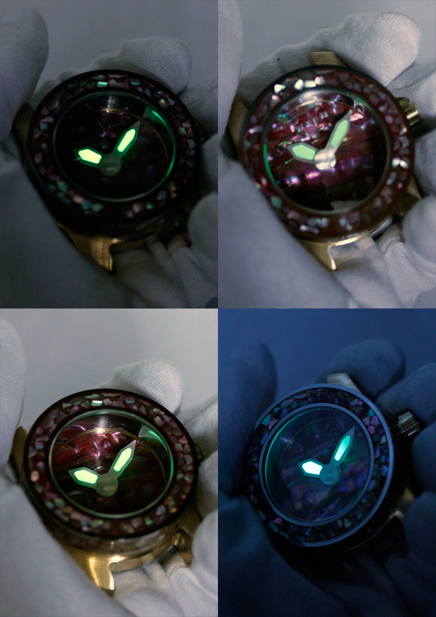A watch concept that combines different layers of materials such as steel, iron, acrylic glass, sapphire, precious woods, and the extraordinary bioluminescent Émail Lumineuse. The base is always a 55 mm platform for a 26 mm bronze watch strap. The outer side of the base still shows the pattern and structure of the milling.