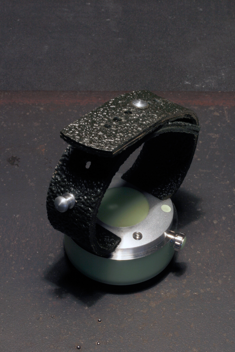 The case made from an inner stainless steel container. A 5 mm thick glowing cold enamel coat surround it. Plexi crystal. historical hand winding movement with two-days power reserve, caliber FHF 96. Back in aliuminium, natural rubber strap