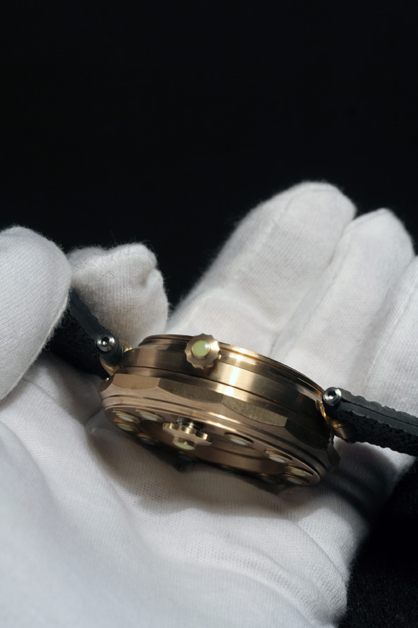 Entire timepiece crafted from Bronze, Brass and German Silver. Sapphire crystal, revolving bezel to set diving time with 11 brass capsules filled with Email Lumineuse Green on Number 12,, 6, 9, Blue for the other hours. Fixing screw and „end-of-dive-time“ marker with Email Lumineuse Green. Dial German Silver with Email Lumineuse hour dots, Brass hour and minute hand „Plique à Jour“ Email Lumineuse Green. Brass crown with Email Lumineuse Green dot, Structured black rubber strap with Angular Momentum locking system, historical mechanical hand-winding movement caliber FHF 72, case diameter 46.00 mm, pressure tested 10 ATM. Completely hand made in the atelier. The luminous powder was gained from oyster powder after an old 17th century process. Slight Irregularities and color differences are unavoidably
