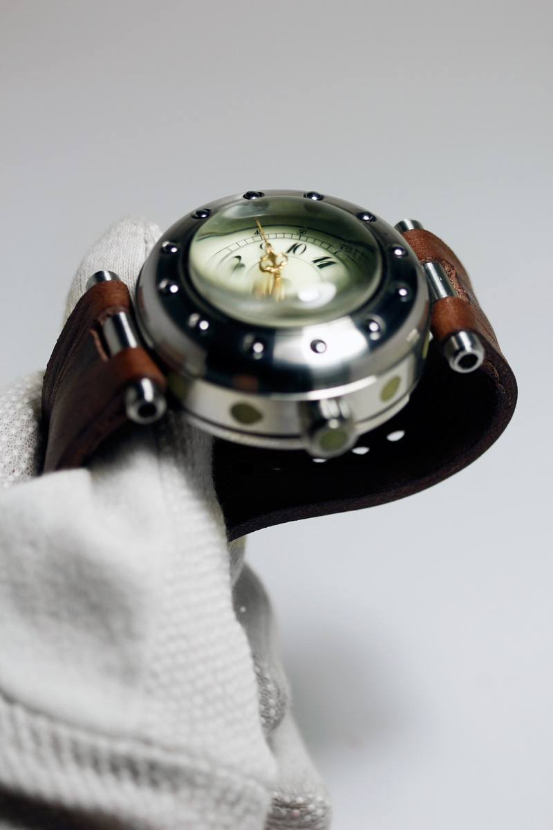 "SPACESHIP" Staempunk watch, completely made from stainless steel. The case 50.00 mm diameter. The dial from sapphire, black printed and the reverse coated with luminous material. The side of the case drilled and filled with luminous material, the same with the crown. The sapphire on the back also coated with luminous material. Historical hand-winding movement, caliber FHF 96 with two days hours power reserve. The strap made from natural rubber used for shoe soles. The luminous powder was gained from oyster powder after an old 17th century process. Slight Irregularities and color differences are unavoidably