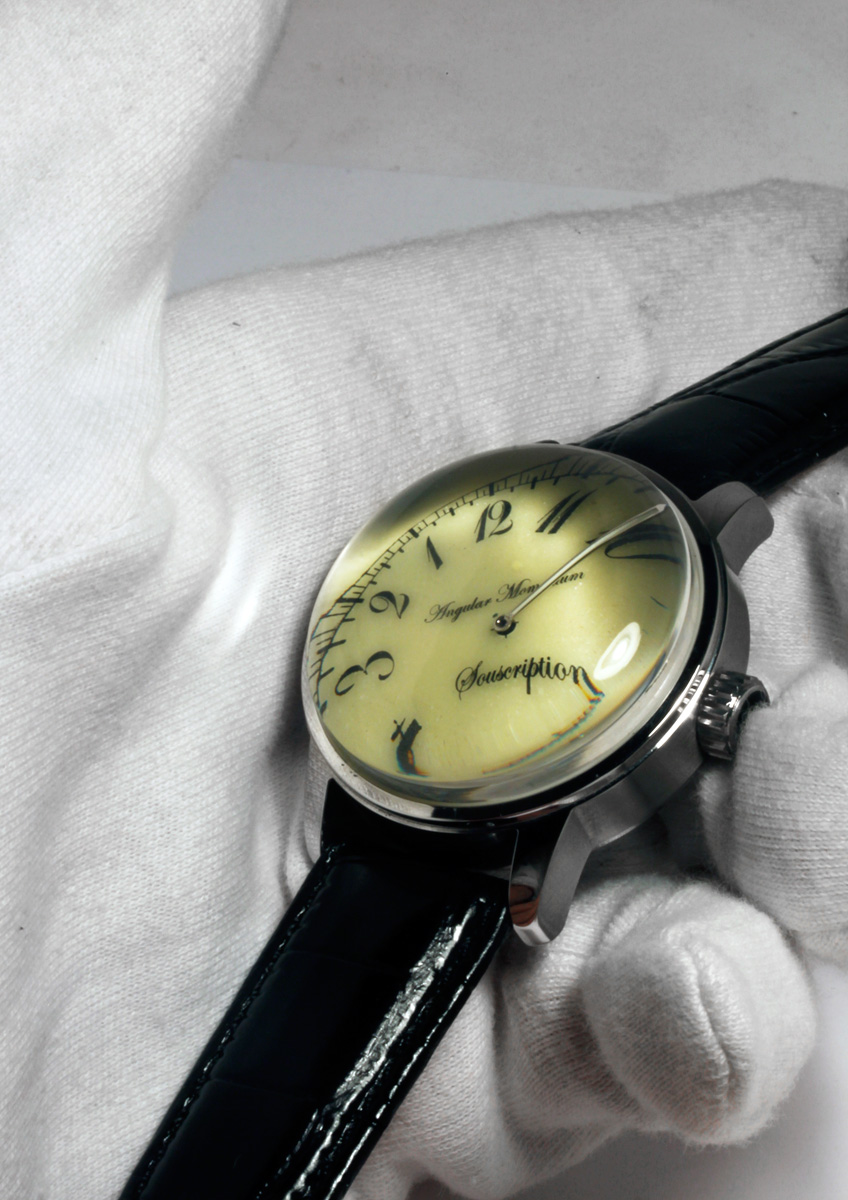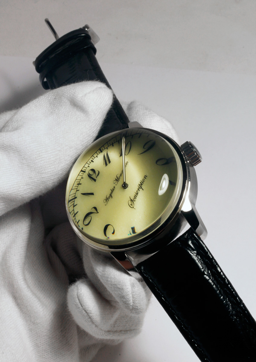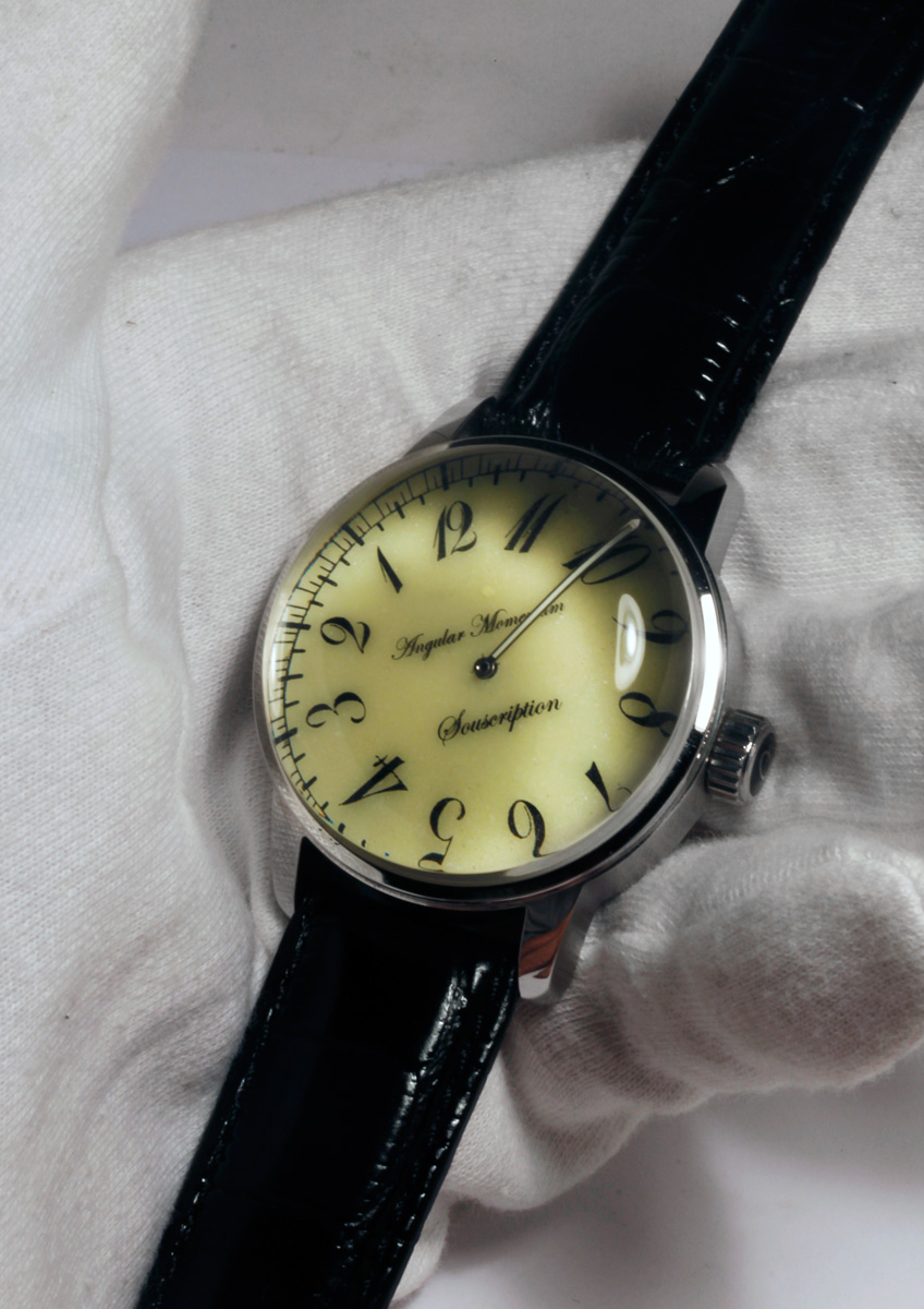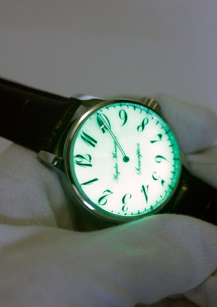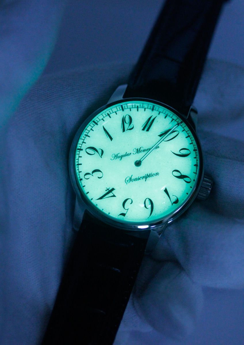 Two-body 1.4435NcU „Stybrite“ steel case, sides satin finished, bezel polished, diameter 42.00 mm, single curved Acrylic crystal, Luminous Revolving-Hour-Disk made of solid Émail Lumineuse with Breguet numerals and Breguet time indication à „Souscription*. The hours read at 12 o‘clock, regular Minute Hand, self-winding movement
