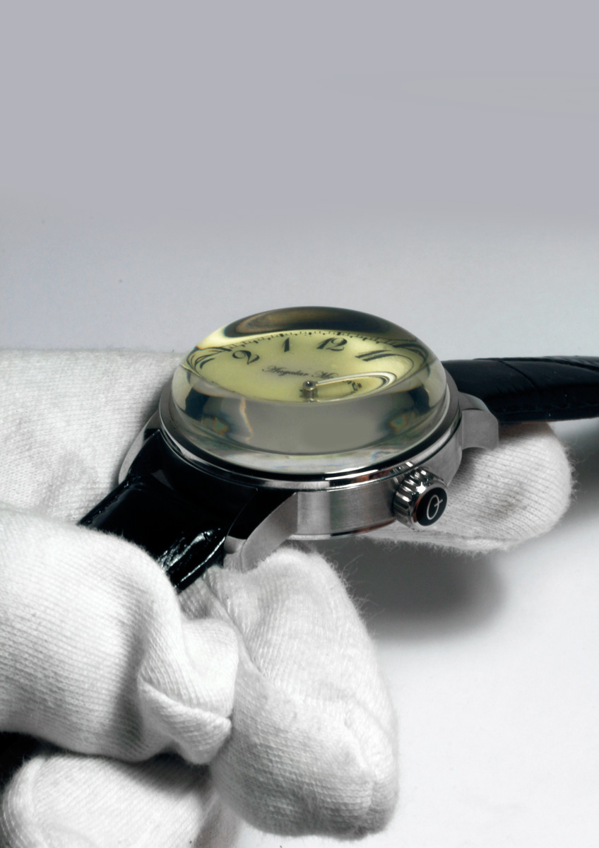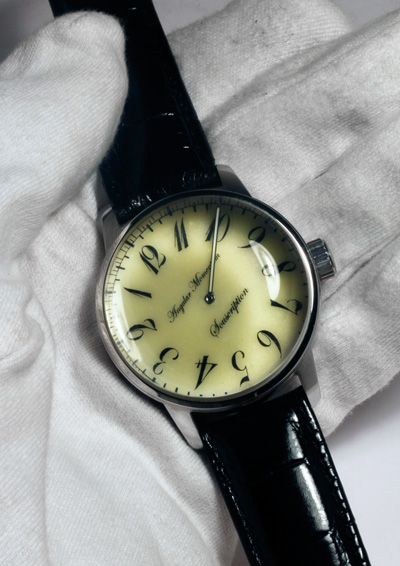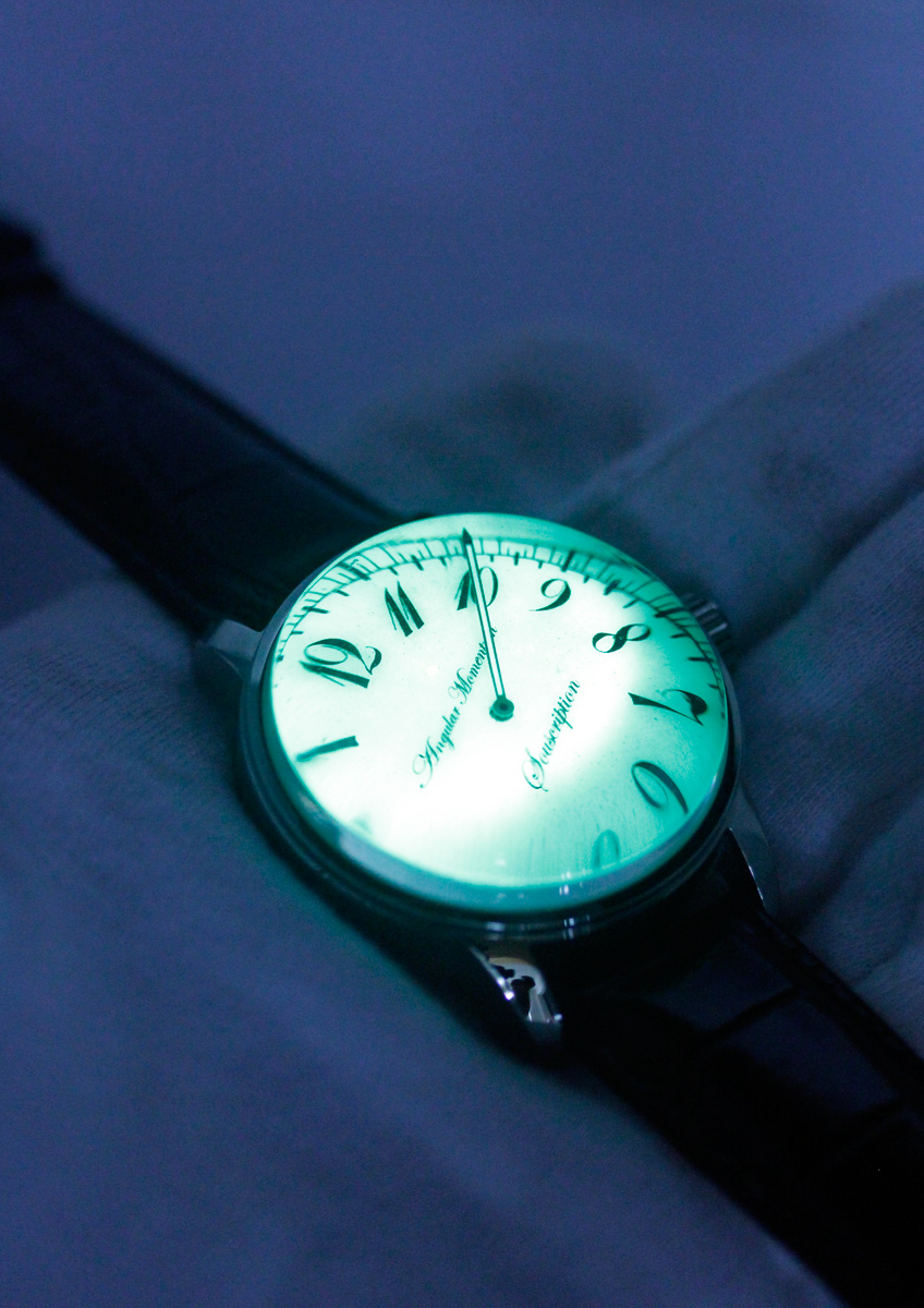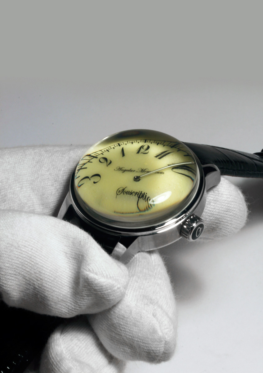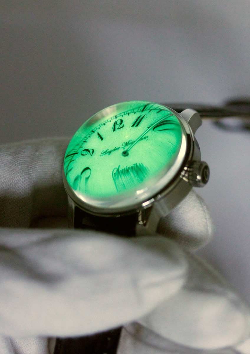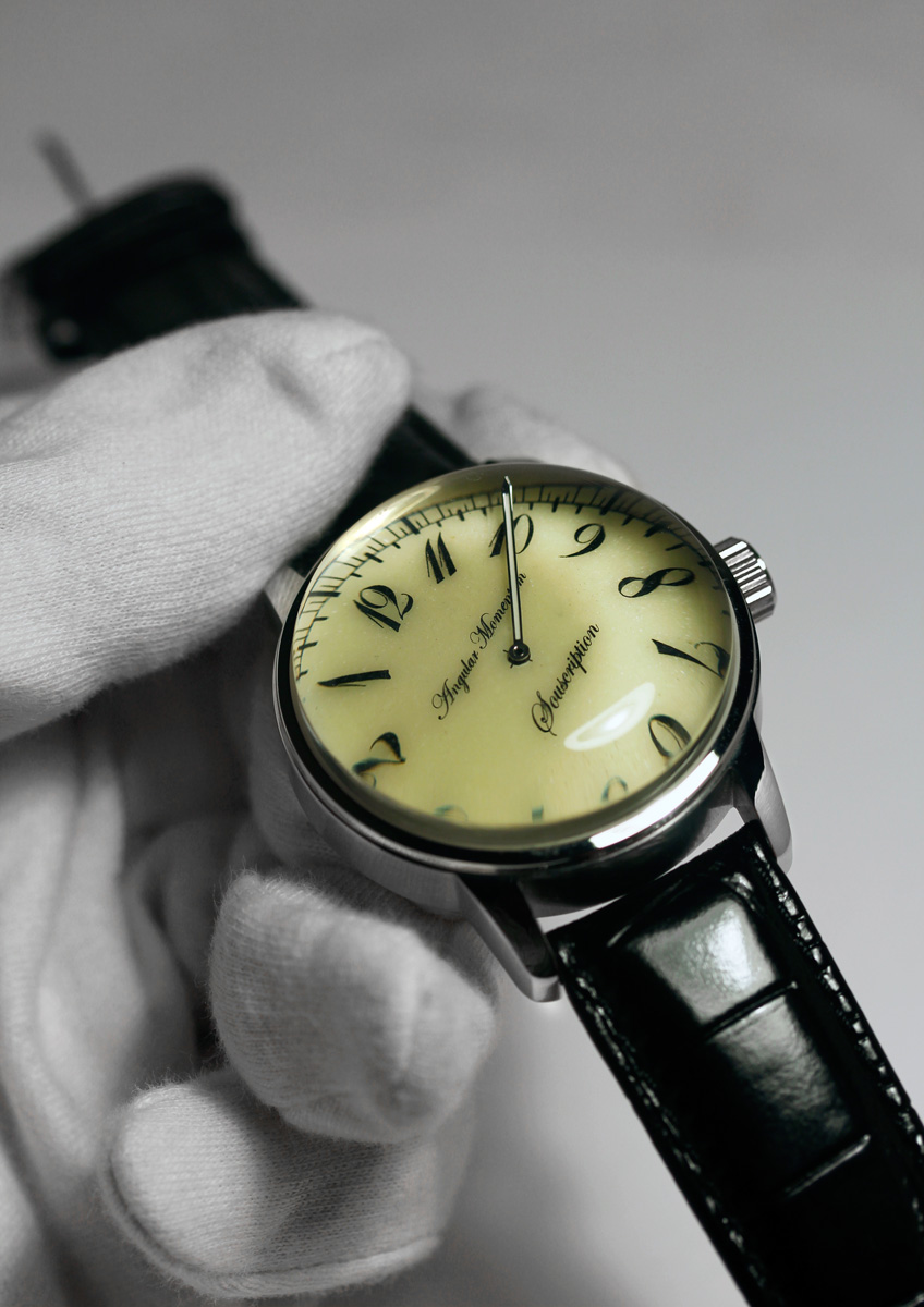 Two-body 1.4435NcU „Stybrite“ steel case, sides satin finished, bezel polished, diameter 42.00 mm, single curved Acrylic crystal, Luminous Revolving-Hour-Disk made of solid Émail Lumineuse with Breguet numerals and Breguet time indication à „Souscription*. The hours read at 12 o‘clock, regular Minute Hand, self-winding movement