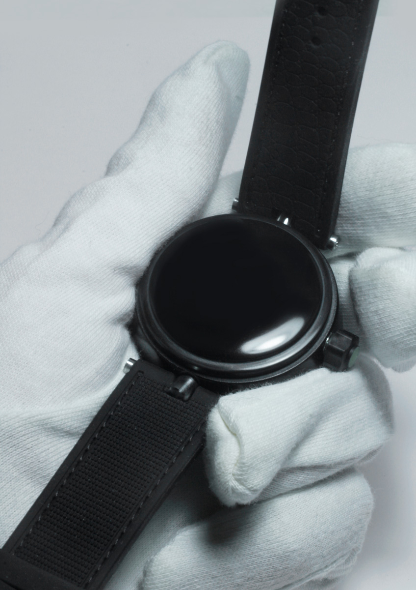 45 mm Ebonite/Vulcanite Case with sapphire crystal. “Rehaut” with solid bioluminescent “Émail Lumineuse”. Satin black dial, solid Émail Lumineuse” Skeleton Hour and Minute Hands, Automatic Movement Caliber ETA 2824. Black Rubber Strap. The weight 49 gr.
