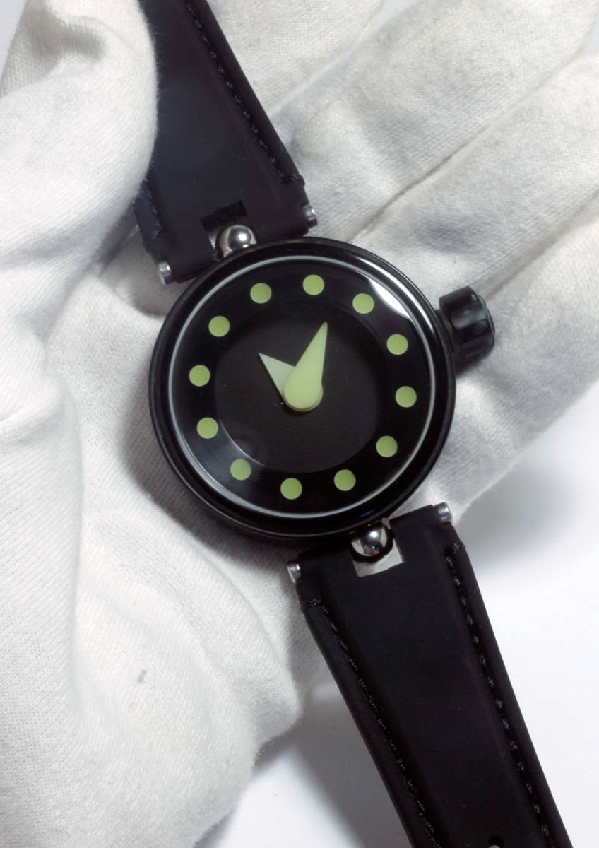 44 mm Ebonite watch case, hour dots in the bezel illuminated with Émail Lumineuse, solid Émail Lumineuse hands, covered by a large curved sapphire crystal. mechanical self-winding movement